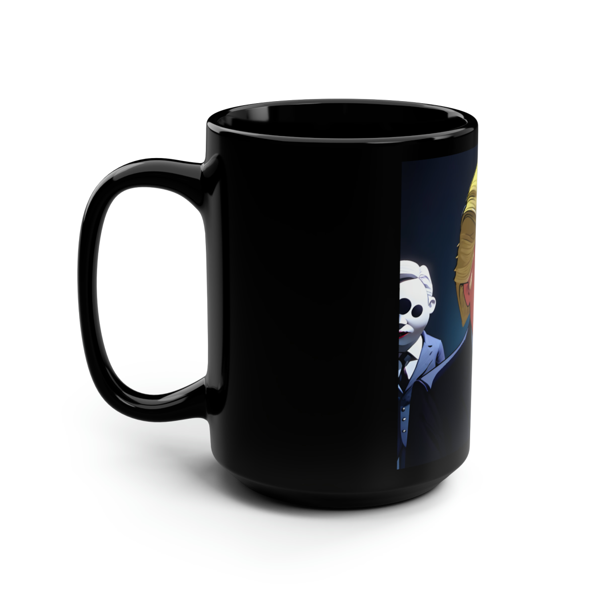 Donald Trump’s mugshot, with Tim Burton-esque dystopian characters completing the scene. Now in a mug!